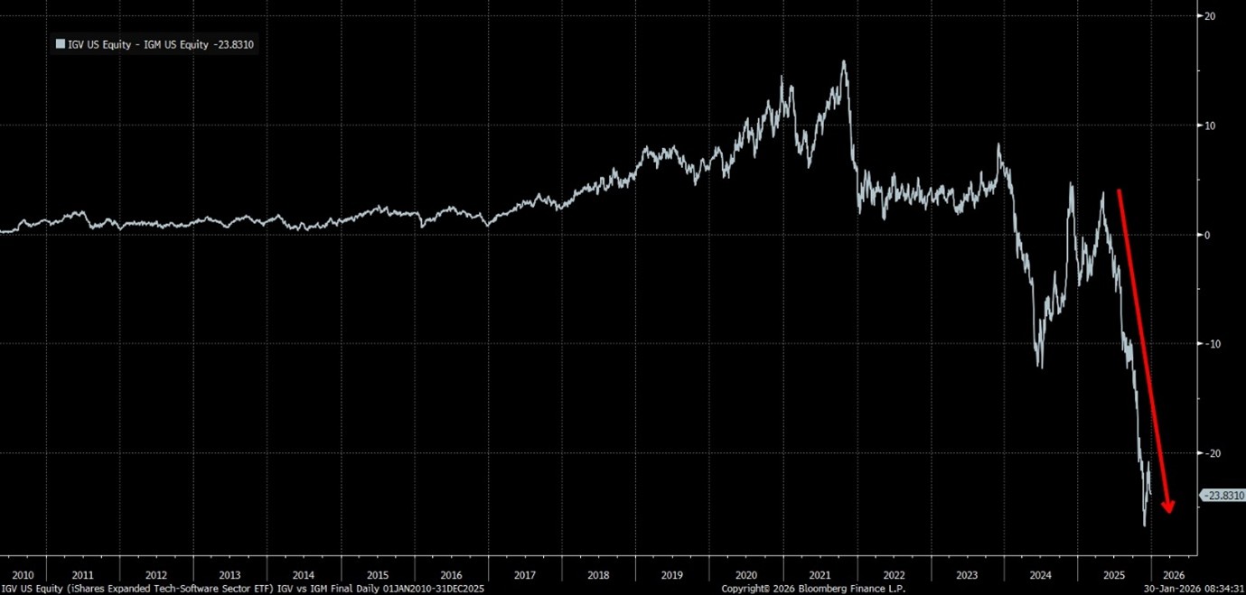As shown above, the market has already begun to price this in. Broad tech and broad software were once highly correlated. This correlation has broken down, with software underperforming significantly. Investors think years ahead; they are placing lower multiples on these companies as their structural advantages come under attack. While "broad tech" maintains its distribution moats for now, the specialised software sector faces the most immediate threat of disruption.