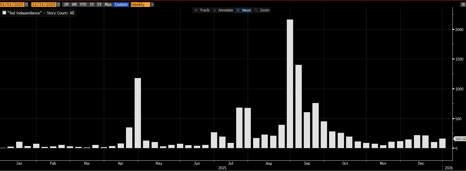 The Federal Reserve currently stands at a crossroads, navigating the difficult "dual mandate" of maintaining price stability while ensuring maximum employment. We have frequently highlighted the precarious juxtaposition the Fed finds itself in. The institutional requirement to remain independent and objective is being tested by a relentless barrage of political pressure from the Trump administration. The graph below tracks the weekly frequency of the term 'Fed independence' across all Bloomberg data sources.
